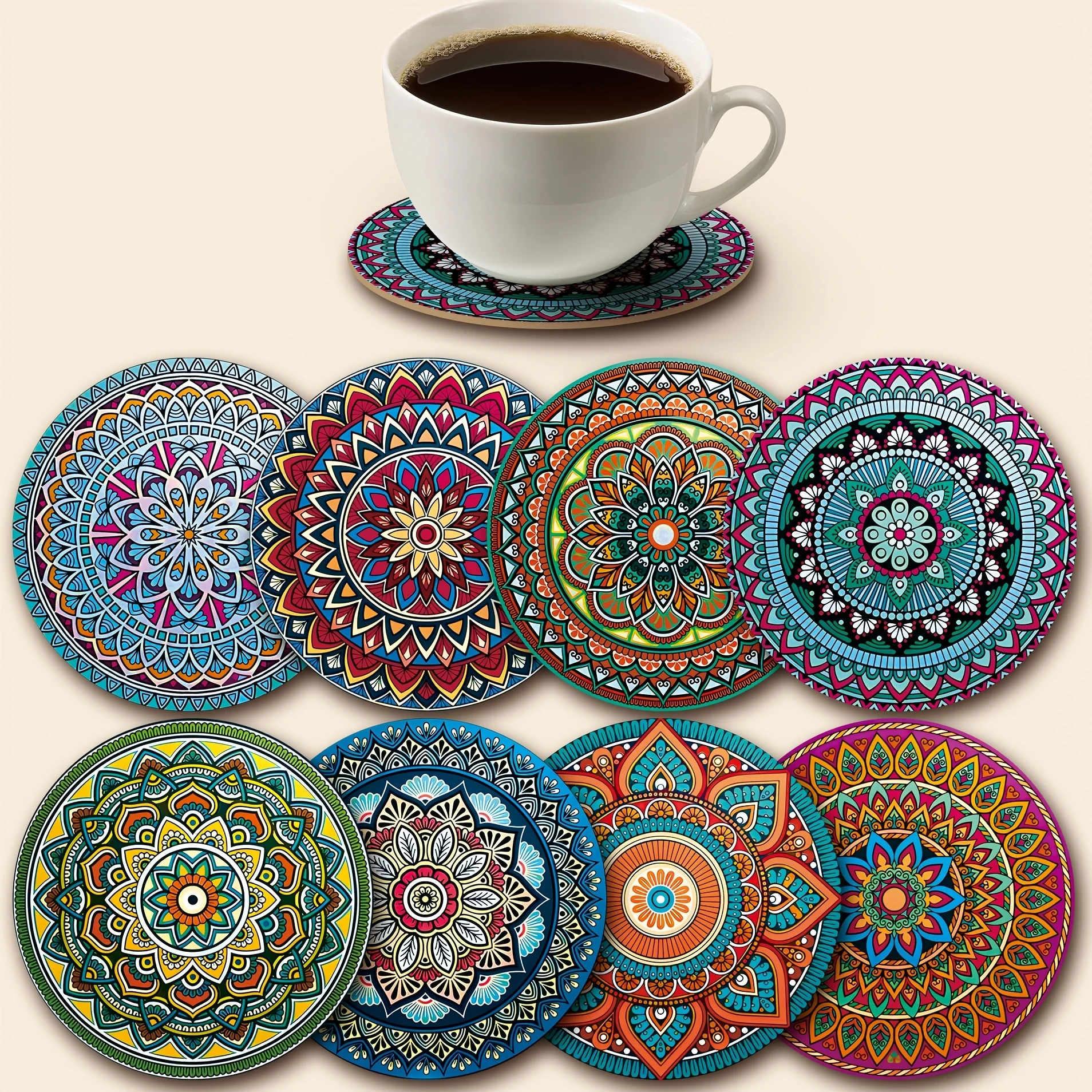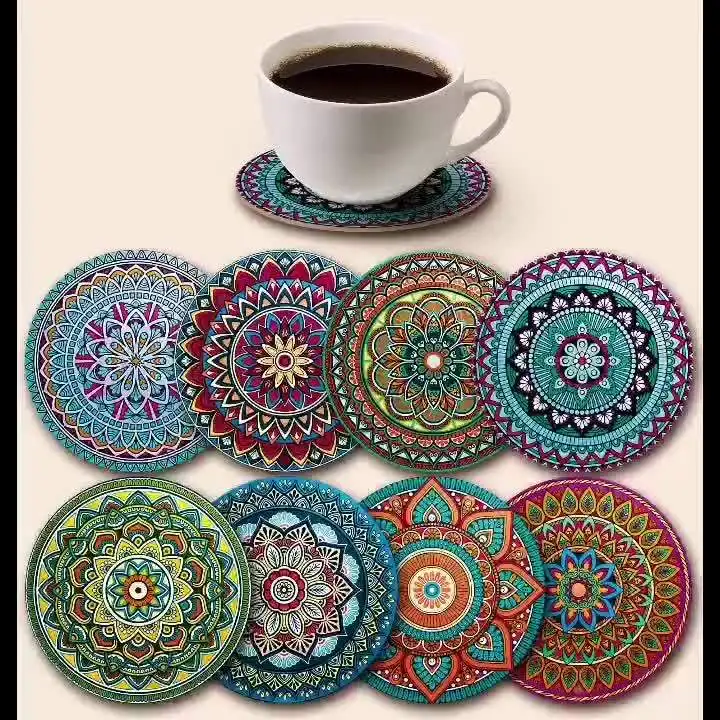 Conjunto de Porta-Copos Mandala | 8 Peças | Coloridos | 10 cm