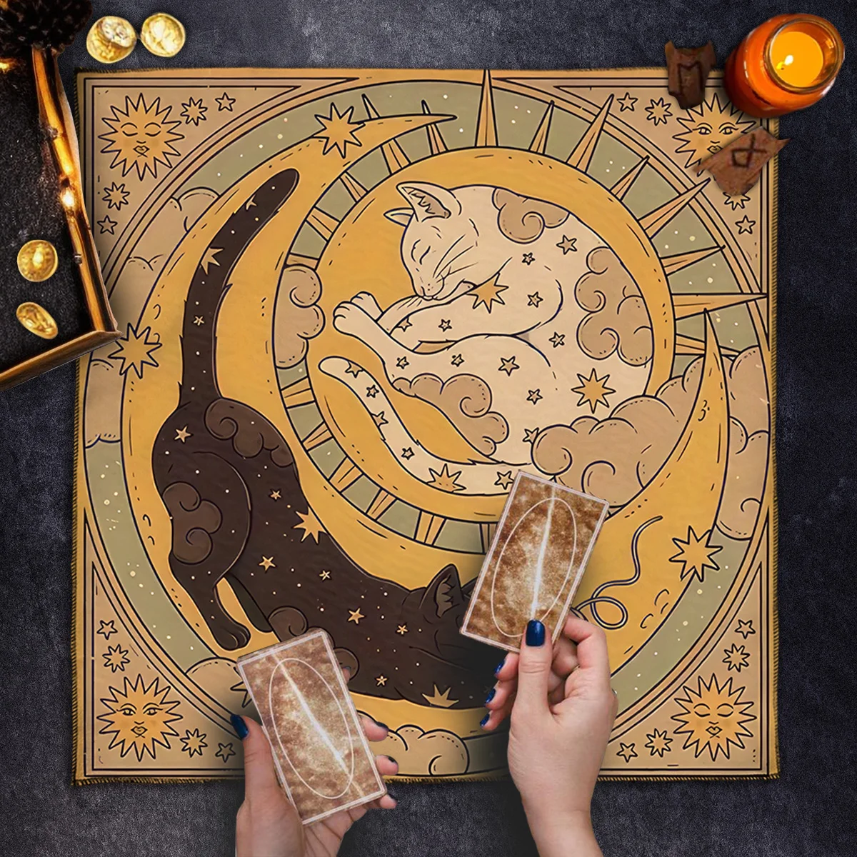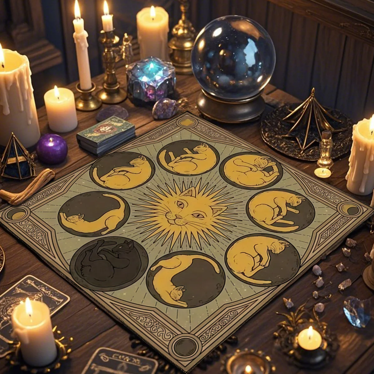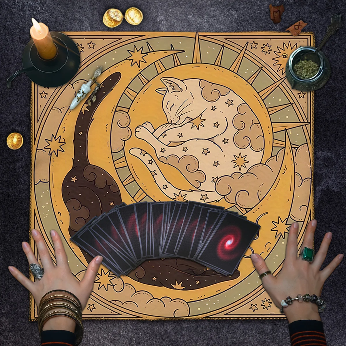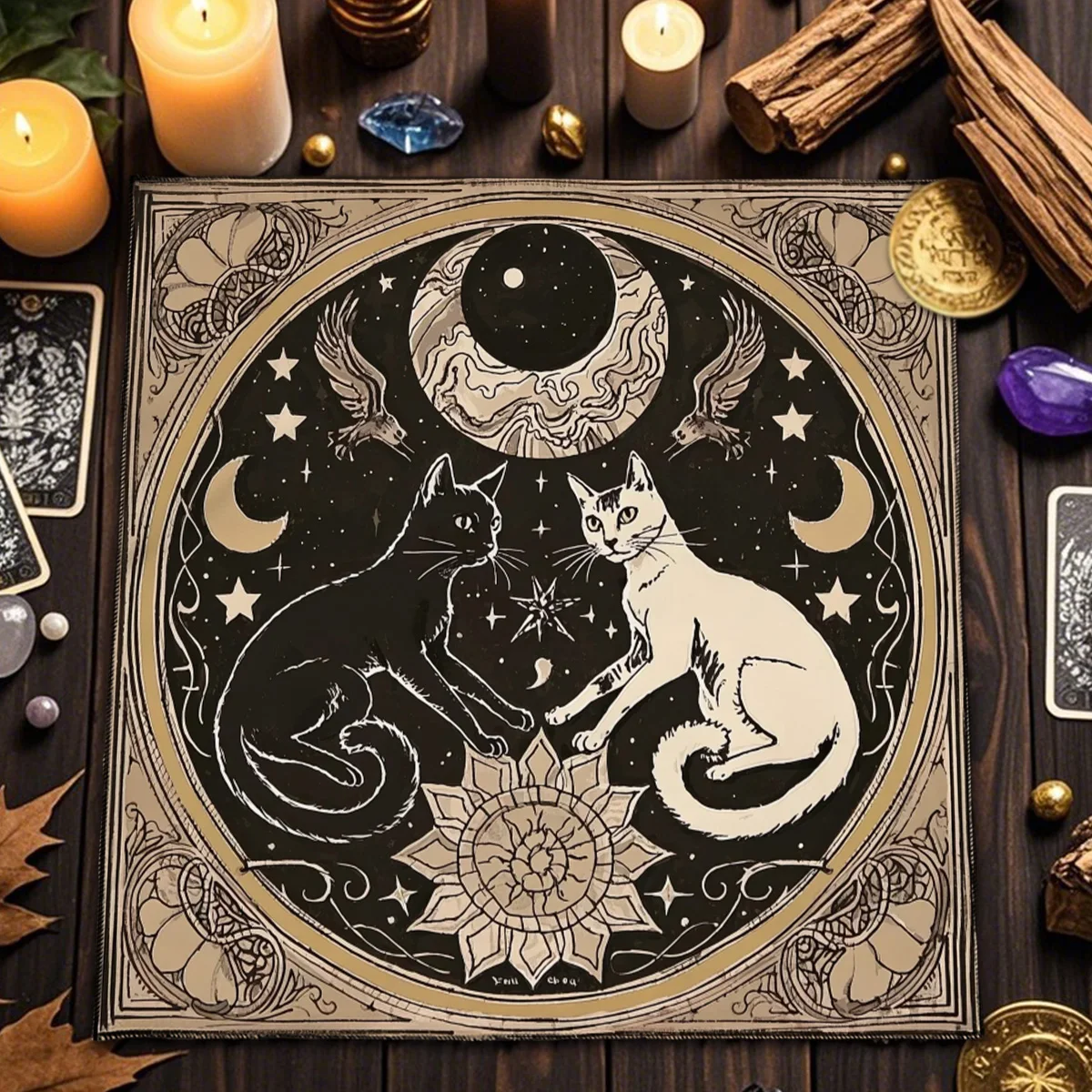 Estampa temática com gato civeta e símbolos místicos, ideal para leituras de tarô, runas ou oráculos.