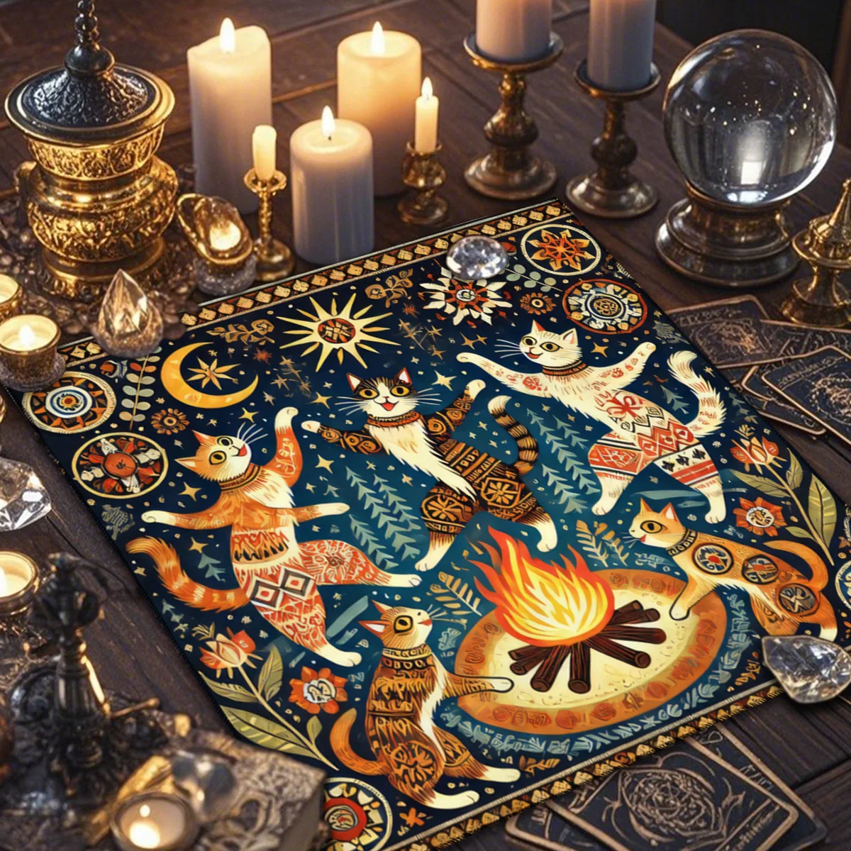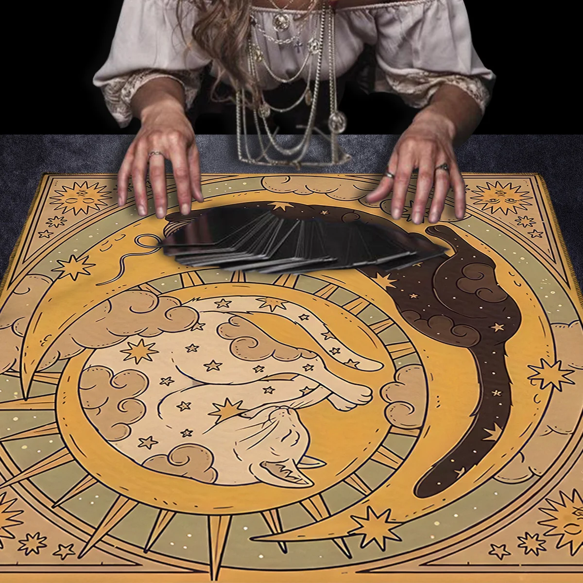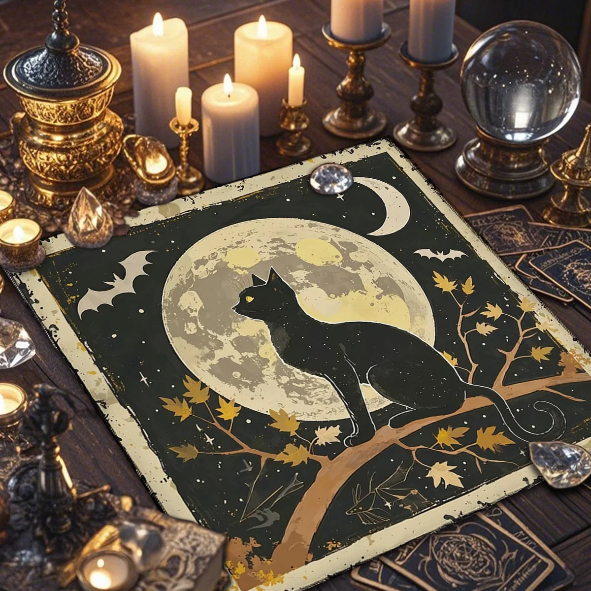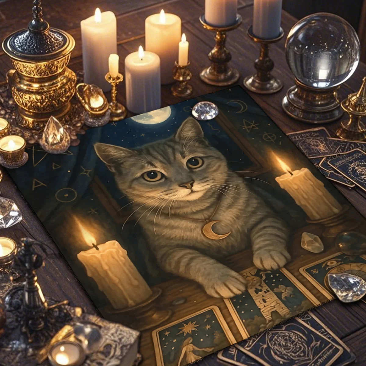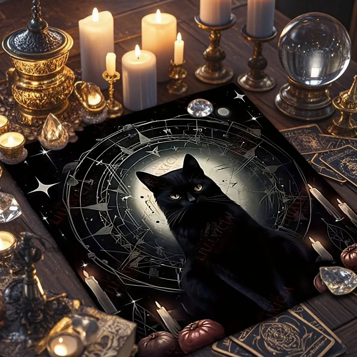 Estampa temática com gato civeta e símbolos místicos, ideal para leituras de tarô, runas ou oráculos.